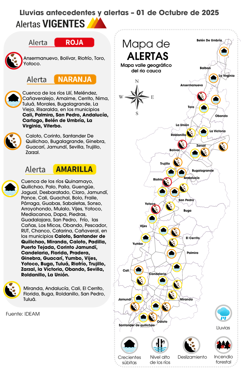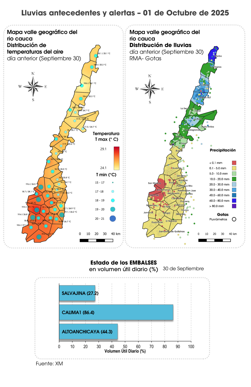 Durante la mañana se presentó tiempo seco. En la tarde se prevén intervalos de lluvias y/o chubascos en las zonas de Norte 2b. Centro Oriente, Sur y Guachinte; no se descartan lloviznas en el valle del río Risaralda y Norte 2a. En la noche tiempo seco. /// Pronóstico octubre 2 : Las precipitaciones para la jornada de mañana se pueden concentrar en el valle del río Risaralda, oriente de Norte 2a, Norte 2b, piedemonte de Centro Oriente, Guachinte y Sur; las demás zonas con nubosidad variable.