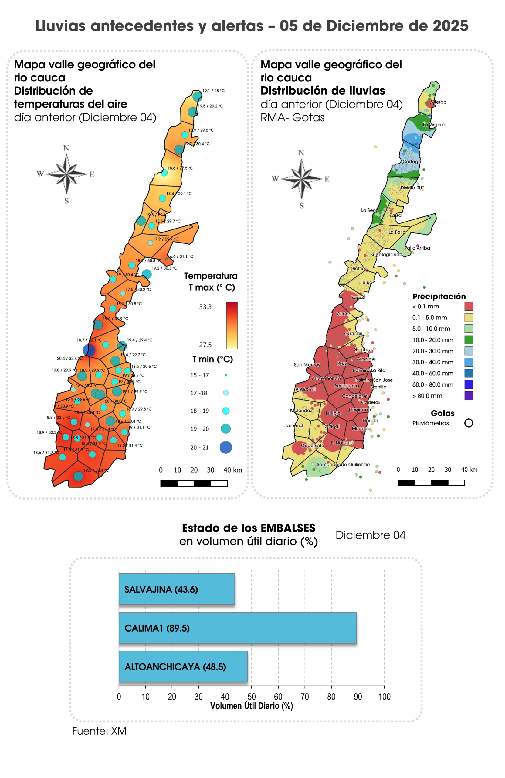 La jornada inició con intervalos de sol y luego se nubló gran parte del VRC por ingreso de nubosidad desde el océano Pacífico. En horas de la tarde el pronóstico no se descartan lloviznas y/o lluvias ligeras en la zona Norte 2a, Norte 2b (Buga-Tuluá); chubascos en Guachinte, Sur (Santander de Quilichao) y valle del río Risaralda. En la noche se espera tiempo seco.