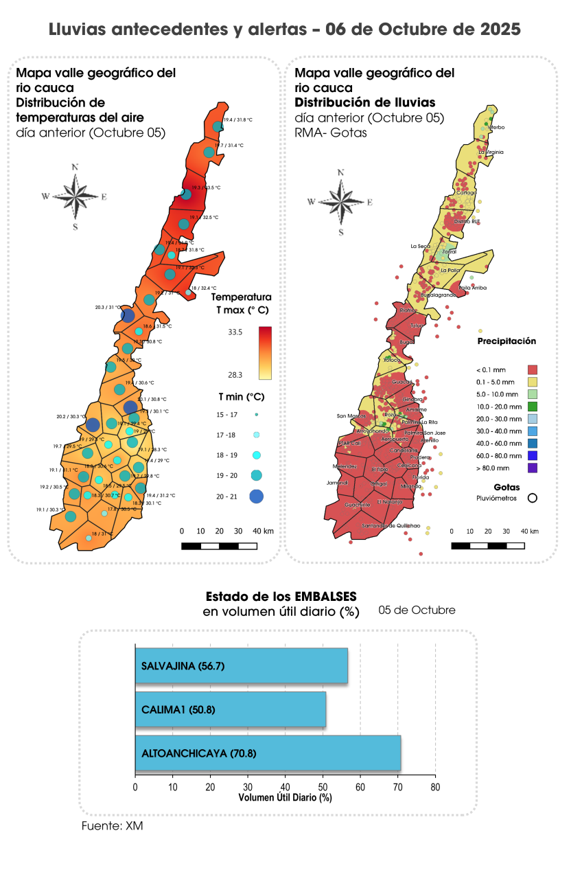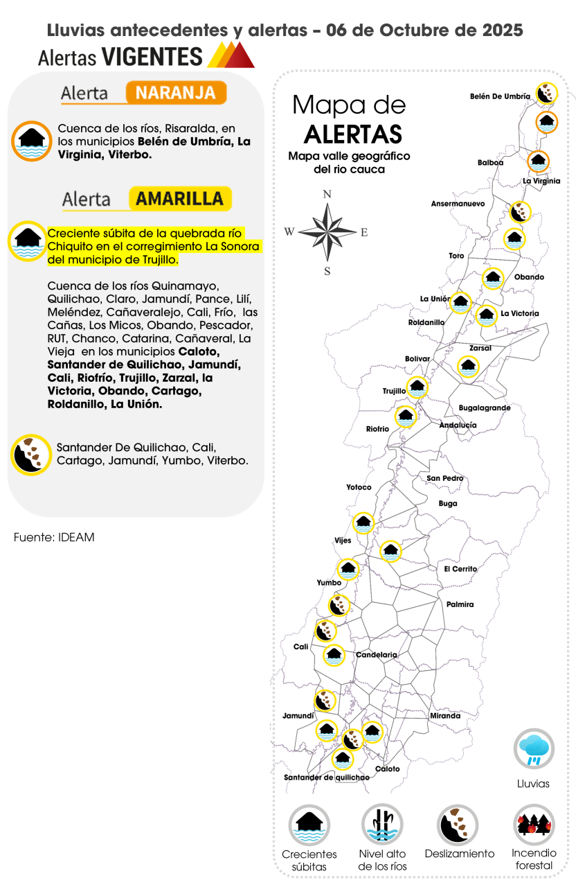 A lo largo de la mañana se ha presentado tiempo seco y mayormente cubierto. en la tarde se prevén lluvias aisladas en las zonas de Norte 2b, Centro Oriente, Centro Sur. Sur y Guachinte; no se descartan lloviznas en el valle del río Risaralda y Norte 2a. En la noche lluvias ligeras en el valle del río Risaralda, Norte 2b. piedemonte sobre la cordillera central.