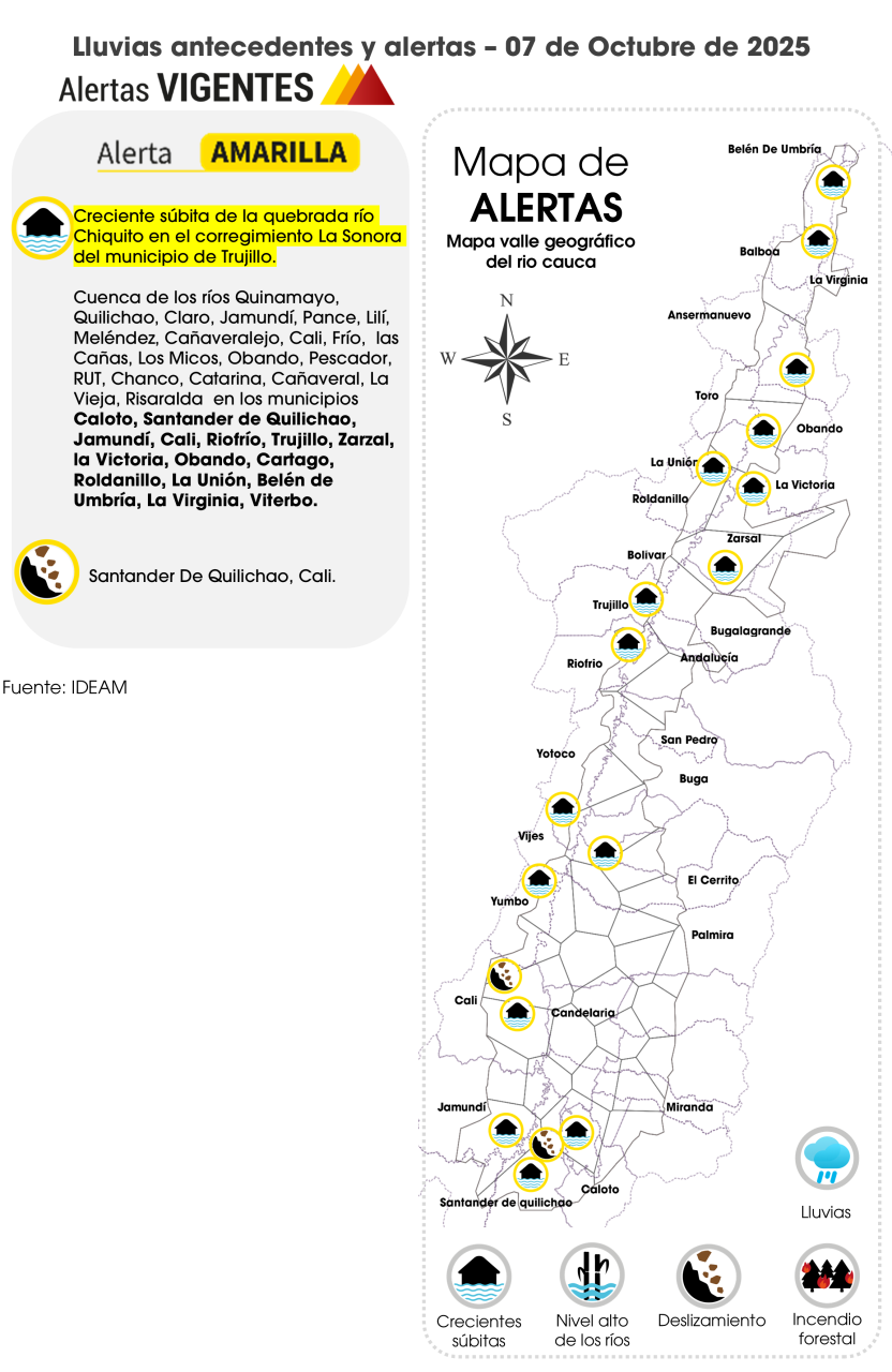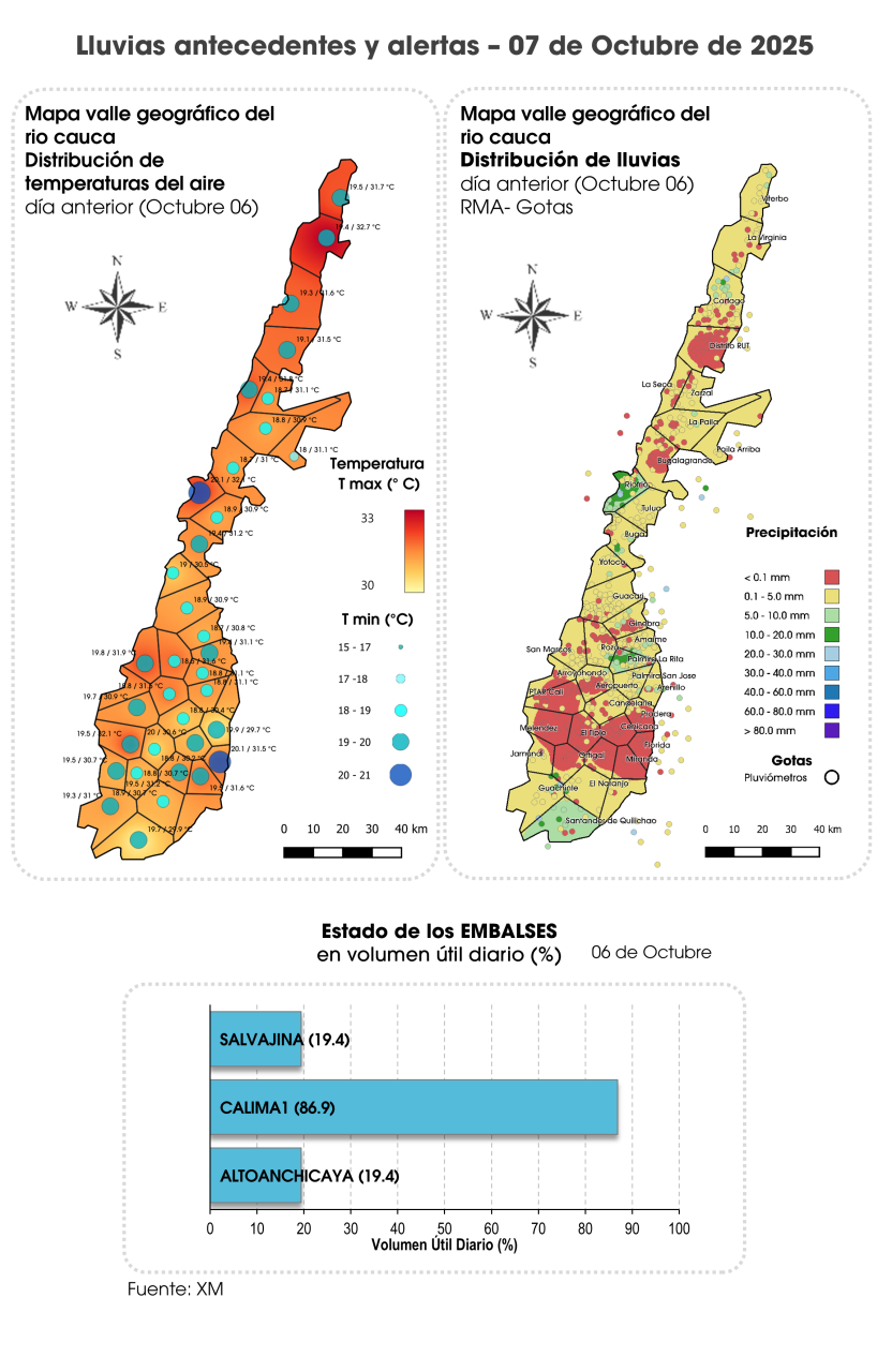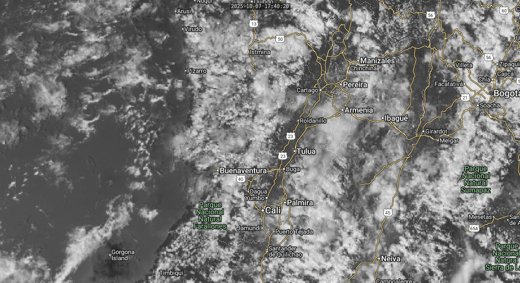 La mañana presentó cielo nublado con algunas lloviznas aisladas. En la tarde se prevén lluvias ligeras en Norte 2a y 2b, piedemonte de Centro Oriente; chubascos en piedemonte de Guachinte y en la zona Sur. En la noche lluvias ligeras en el valle del río Risaralda, Norte 2b, Centro Sur y Sur. /// Pronóstico Octubre 8: Se proyecta un día con cielo nublado y mayormente nublado con intervalos de ligeras a moderadas en el centro occidente y centro del valle del río Cauca, Centro Occidente, Norte 2, Centro Oriente, Centro Sur. En la zona Sur al caer la tarde y en la noche se estiman lluvias moderadas.