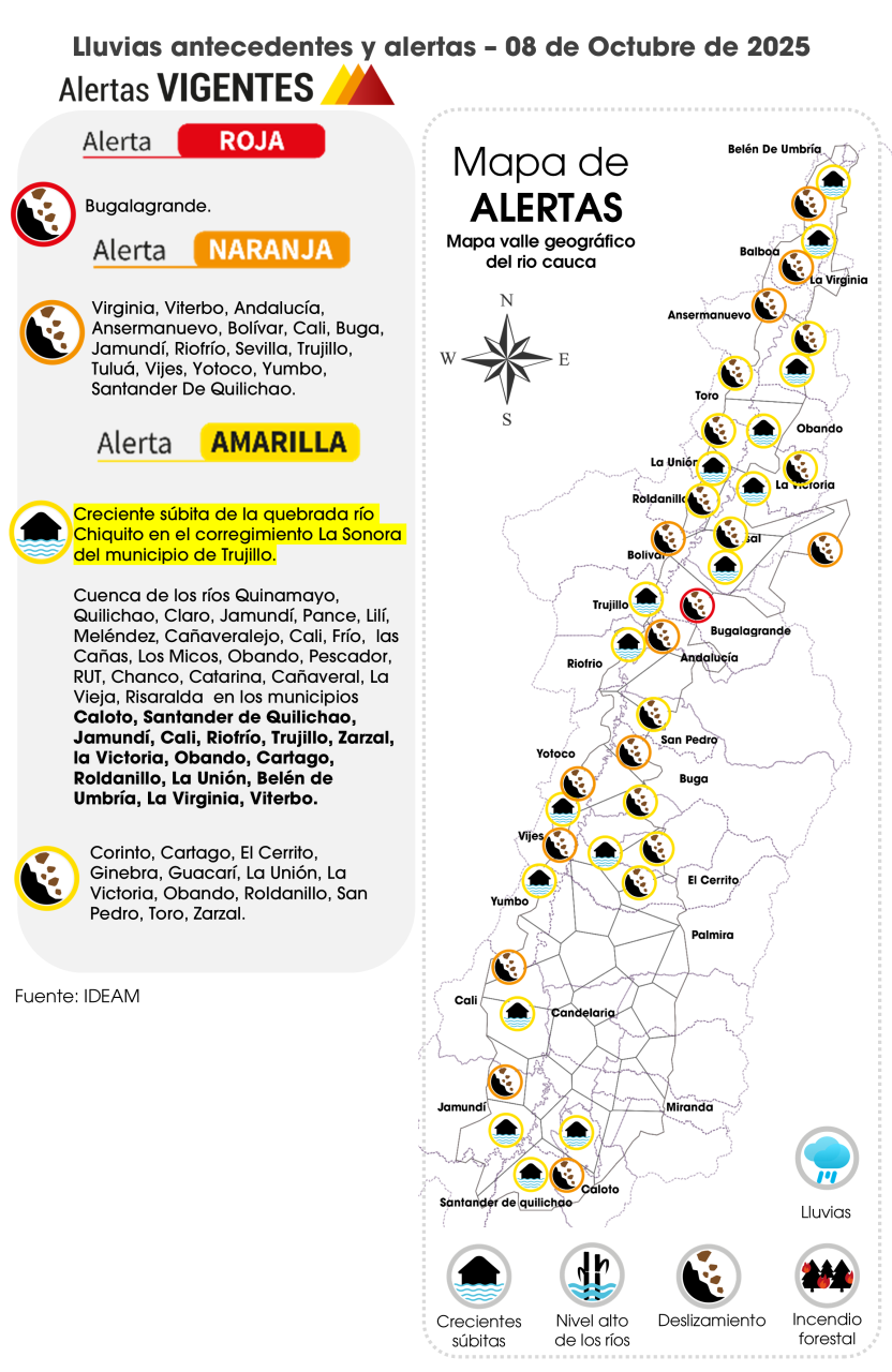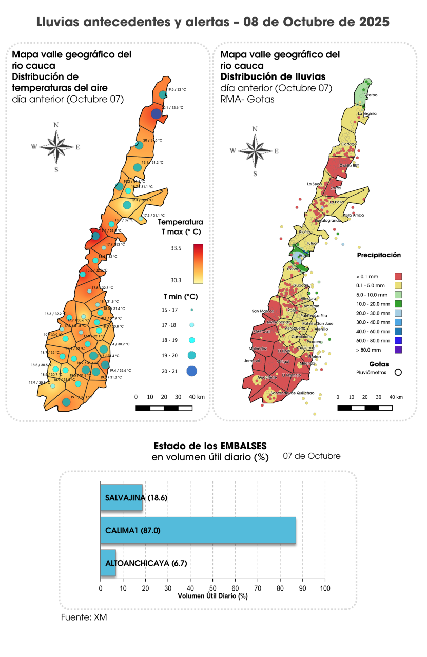 La mañana presentó cielo nublado con algunas lloviznas aisladas. Se prevé cielo nublado y mayormente nublado con intervalos de ligeras a moderadas en el valle del río Risaralda, Centro Occidente, Norte 2a y b, Centro Oriente, Centro Sur. En la zona Sur al caer la tarde y en la noche se estiman lluvias moderadas. Pronóstico Octubre 9: La jornada estará caracterizada por cielo cubierto y mayormente cubierto con intervalos de lluvias concentradas en las zonas Norte 2a y 2b, Centro Oriente (Norte y Piedemonte), Centro Sur (extremos oriente y extremo occidente), Sur y Guachinte. Probabilidad de actividad eléctrica en momentos de lluvia intensa. Precipitaciones de menor intensidad en el valle del río Risaralda salvo en Viterbo donde se esperan mayores volúmenes.