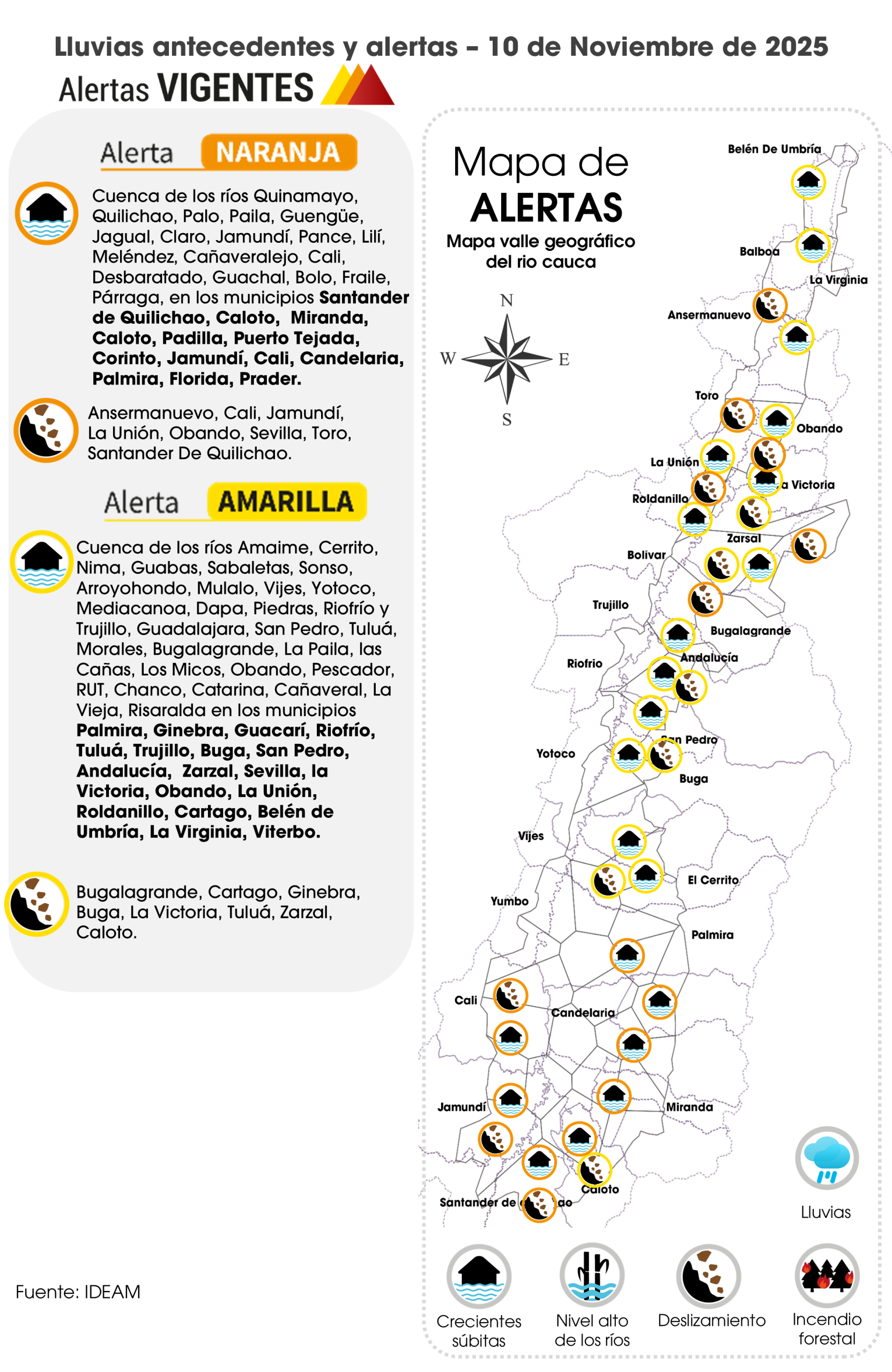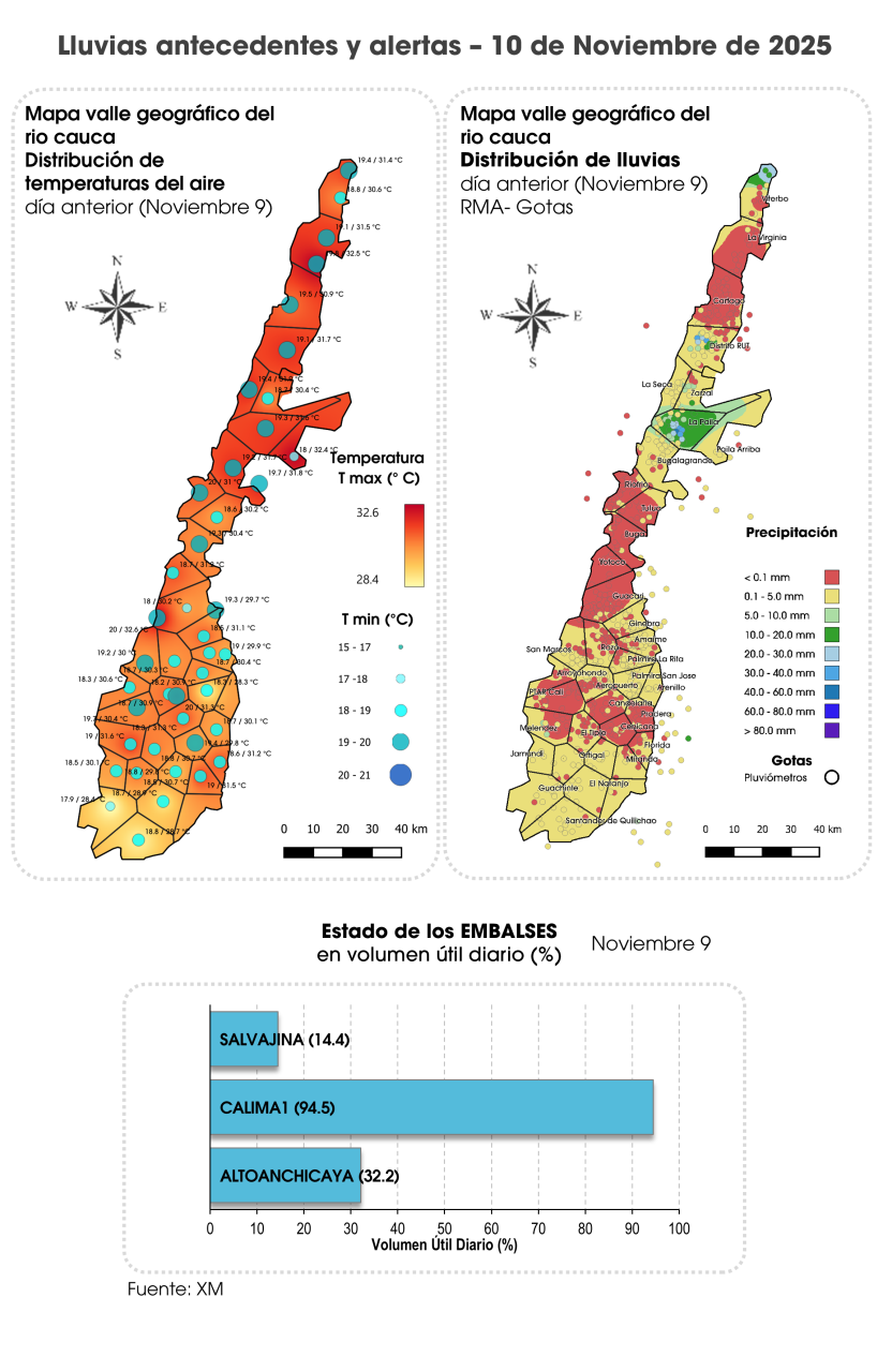 Pronóstico Noviembre 11: Se pronostica una mañana con tiempo seco. En la tarde y primera parte de la noche están previstos chubascos en el oriente del valle del río Risaralda, Norte 2b, Guachinte y Sur (Santander de Quilichao). Lloviznas en Centro Oriente y Centro Sur.