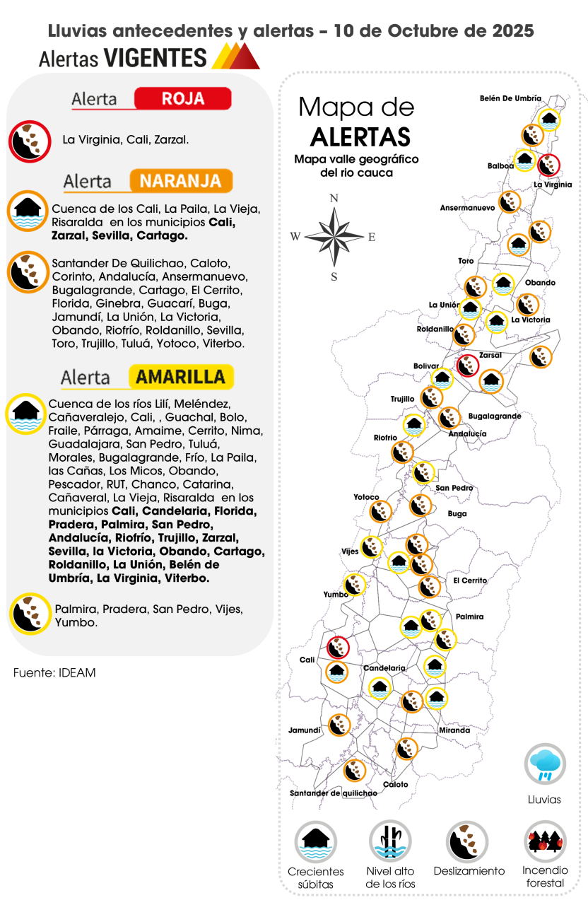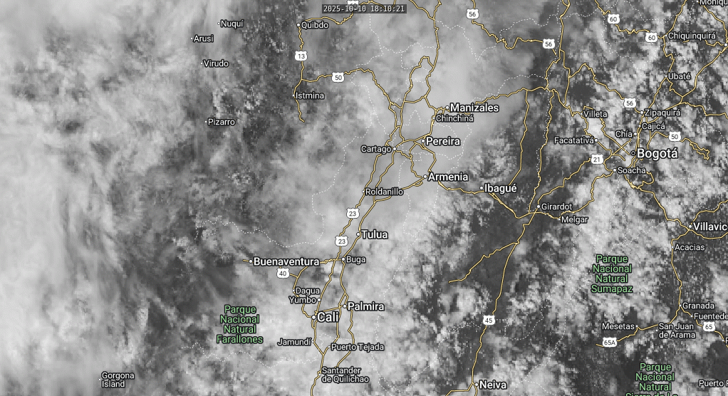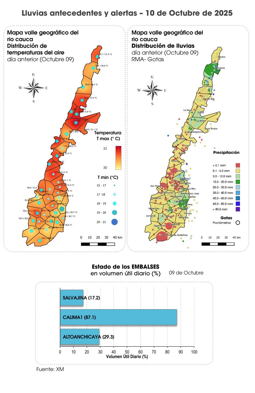 En el transcurso de la mañana predominó el cielo nublado con lloviznas intermitentes en gran parte del valle del río Cauca. La tarde predominará con cielo nublado e intervalos de precipitaciones en gran parte de la región. La noche presentará intervalos de lluvias en el extremo norte, en las zonas de Norte 2b, Centro Sur, Sur y Guachinte. Pronóstico Octubre 11: Se prevé una jornada con cielo nublado e intervalos de lluvias moderadas en el valle del río Risaralda, oriente de Norte 2a, Norte 2b, Centro Oriente, Centro Sur y Sur. En la noche lluvias intensas en Centro Oriente, Centro Occidente y Sur. Pronóstico Octubre 12: Temprano en la mañana no se descartan lloviznas en el extremo norte y sur del VRC. En la tarde y noche incremento de nubosidad desde las cordilleras central y occidental favoreciendo chubascos en Centro Oriente, Norte 2b, norte de Centro Occidente, Sur y Guachinte. Pronóstico Octubre 13: Se prevé un día seminublado a mayormente nublado con probabilidad de lluvias en la tarde en Norte 2 a y 2b, y lluvias más intensas en Centro Oriente, Centro Sur y Sur.