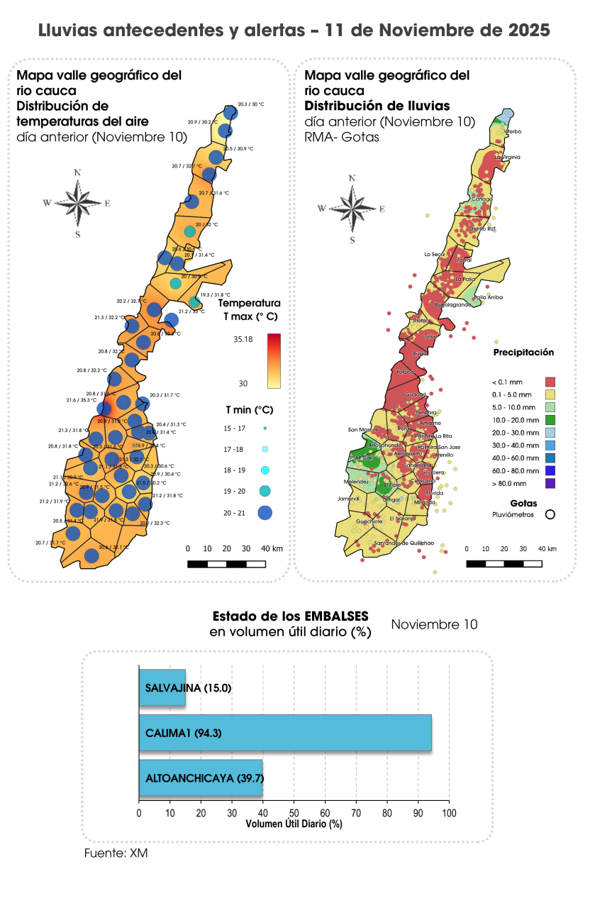 La mañana presentó tiempo seco en la región, En la tarde se espera cielo parcialmente cubierto sin descartar lluvias en Norte 2b (Tuluá-Buga), Guachinte, Sur (Santander de Quilichao) y piedemonte de Centro Sur (Miranda). En horas de la noche no se descartan lloviznas en Norte 2b, Sur, Centro Sur y Centro Oriente.