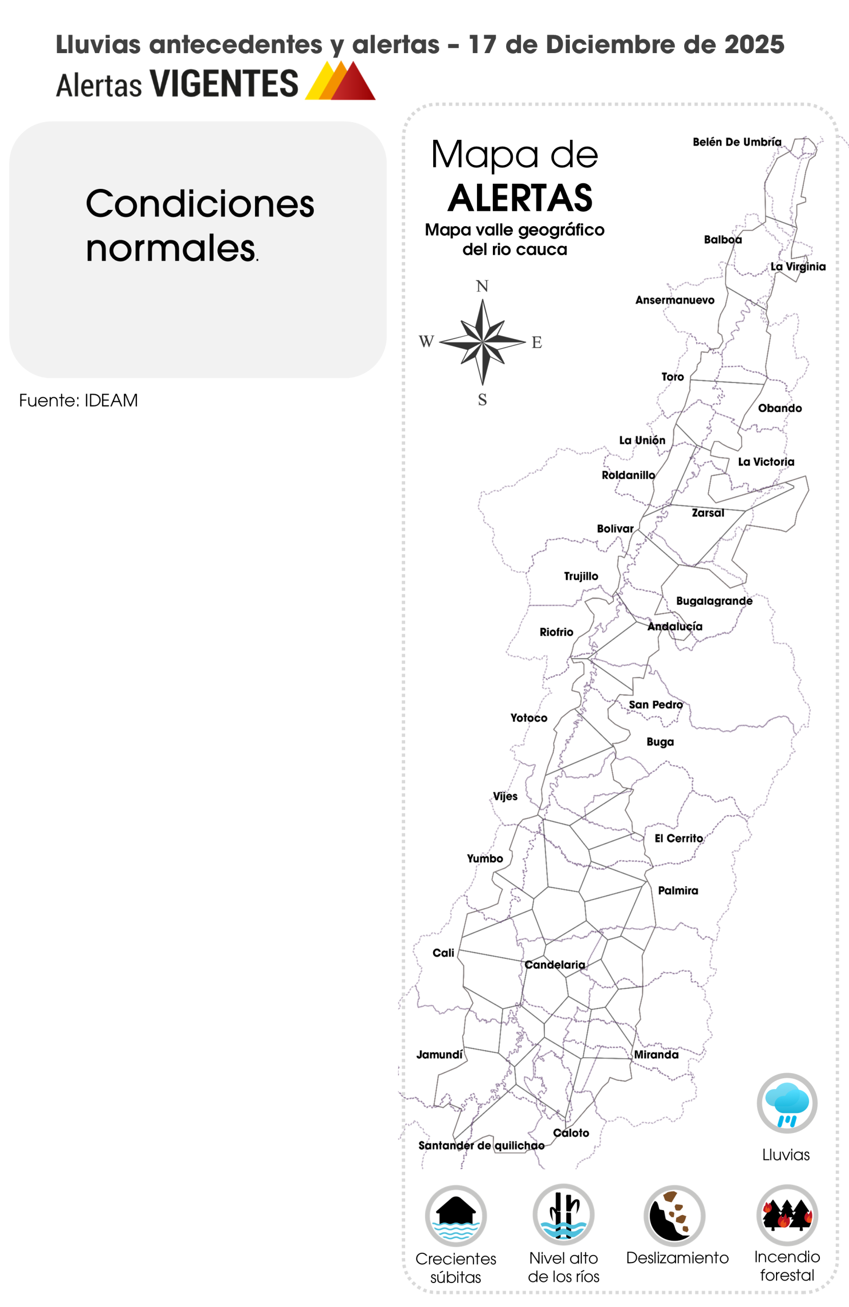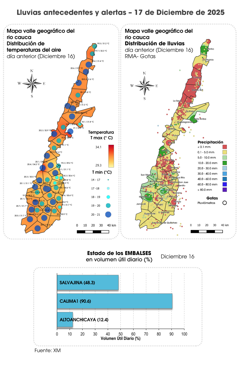 DICIEMBRE 18: Temprano en la mañana no se descartan lluvias ligeras en el sur del VRC. En la tarde se estima mayor nubosidad en el valle del r. Risaralda, Norte 2b, centro Oriente, Centro Sur, y Sur, chubascos en Guachinte y en la noche lluvias en la zona Sur, Norte 2b, y v.r.Risaralda.