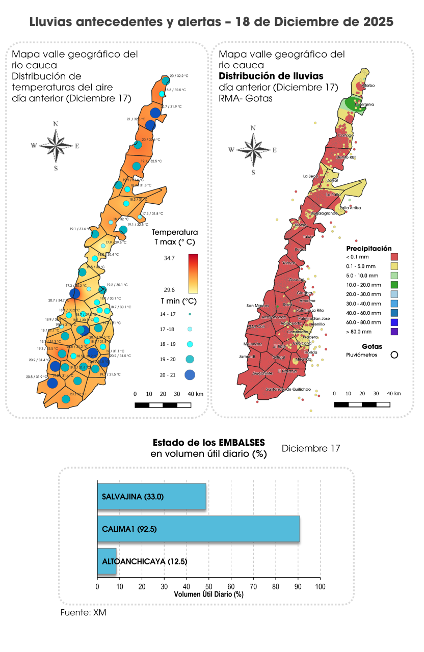 Durante la mañana se ha registrado tiempo seco. El pronóstico en horas de la tarde indica nubosidad variable con intervalos de lluvias ligeras en las zonas de Norte 2b, centro Oriente; chubascos en Guachinte y Santander de Quilichao; en la noche lluvias ligeras en la zona Sur, Guachinte, Norte 2b, Centro Oriente y v.r.Risaralda.