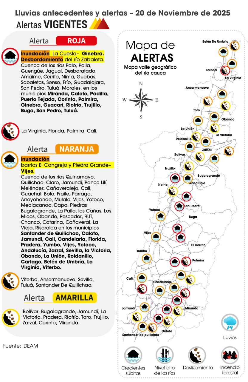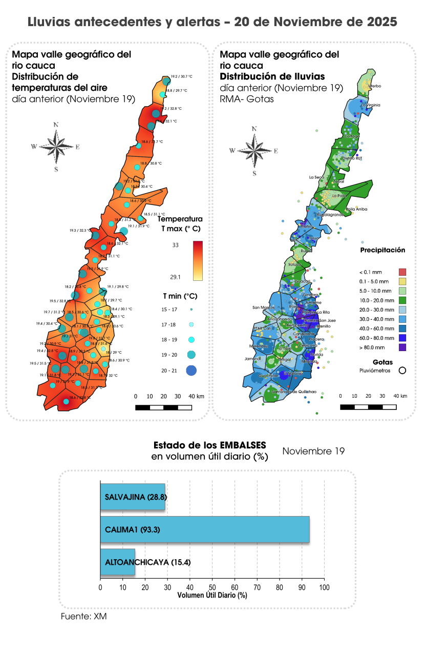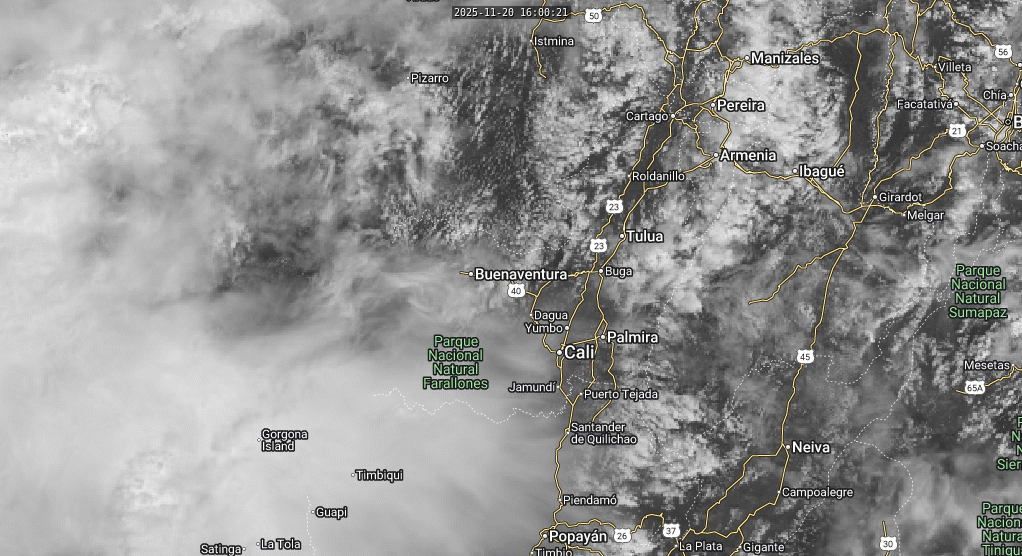 A primeras horas de la mañana el cielo permaneció nublado y mayormente nublado. En la tarde se estima mayor nubosidad sobre las cordilleras central y occidental por lo que lluvias de corta duración se pueden presentar hacia el oriente de Buga, Piedemonte de centro Oriente, Guachinte y occidente de Centro Sur y Sur ( Santander de Quilichao); lluvias ligeras en el valle del río Risaralda. En la noche no se descartan lluvias ligeras en el valle del río Risaralda. Sur y Guachinte.