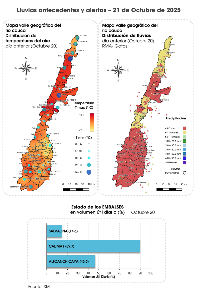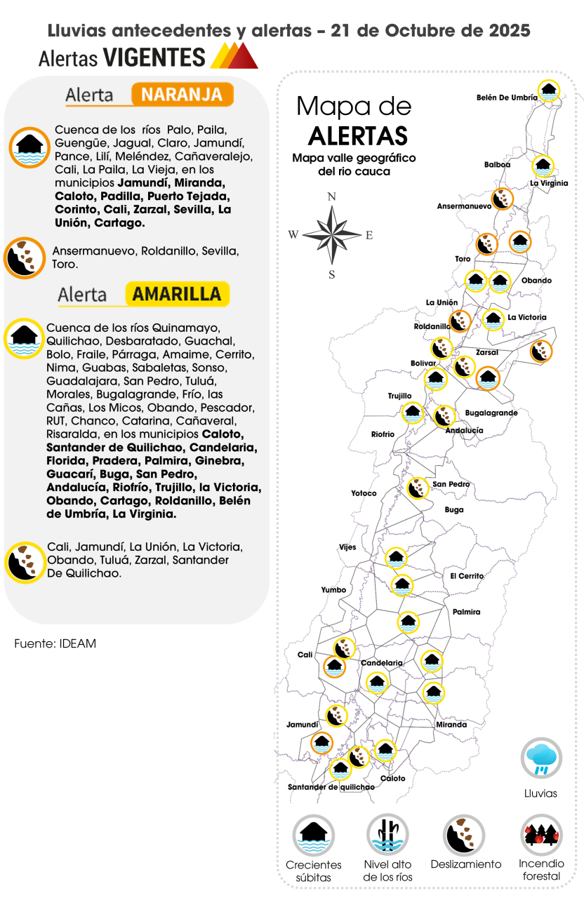 Pronóstico Octubre 22 : La jornada estará dominada por cielo nublado e intervalos de lluvias moderadas en Norte 2b; Centro Oriente, piedemontes de Centro Sur, Guachinte y Sur. Lloviznas y/o lluvias ligeras eventuales en Norte 2a y valle del río Risaralda.