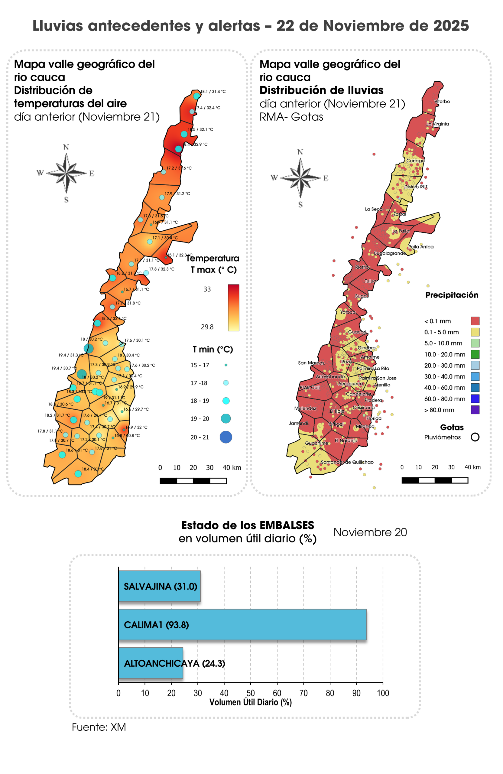 Se espera una jornada con tiempo seco predominante aunque con intervalos de lloviznas esporádicas en el valle del río Risaralda y Norte 2a en la mañana. En la tarde aunque predominará el tiempo seco no se descartan lluvias ligeras puntuales cerca del piedemonte de Centro Oriente,, en el valle del río Risaralda, y Sur; chubascos en Guachinte. En la noche son previstas lluvias ligeras en el valle del río Risaralda, Norte 2b, Centro Oriente, Centro Sur, Sur y Guachinte.