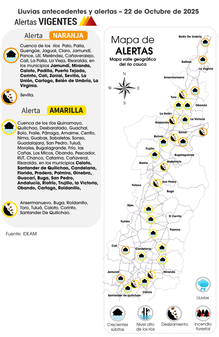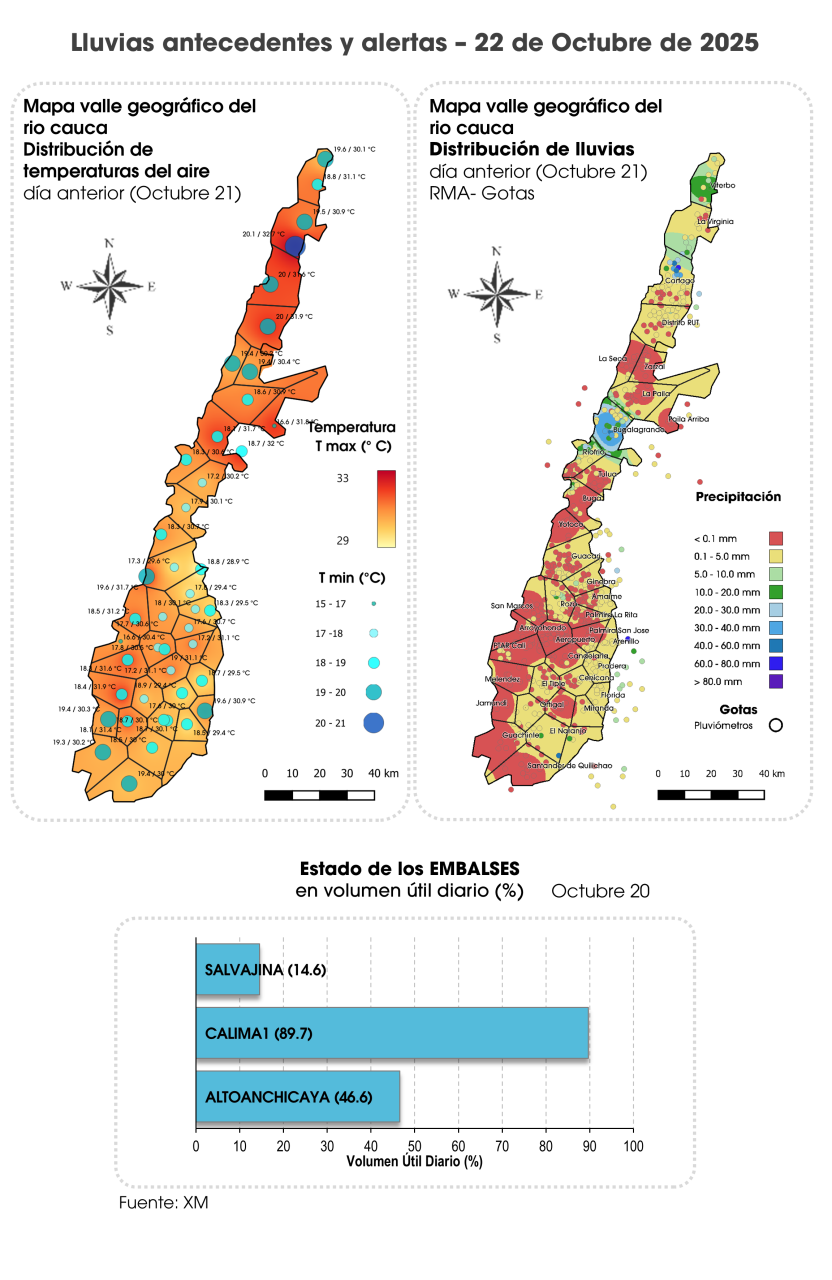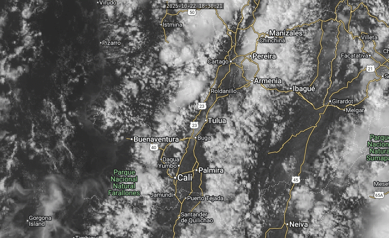 La mañana de hoy presentó cielo seminublado. A inicios y mitad de la tarde se prevé nubosidad variable con intervalos de sol sin descartar lluvias y/o chubascos en el norte del VRC en el valle del río Risaralda y piedemonte de Norte 2a, Norte 2b, piedemonte de Centro Oriente, Sur y Guachinte. Pronóstico Octubre 23:​ La jornada se caracterizará por cielo parcialmente nublado en la mañana y parte de la tarde, sin embargo, en horas de la tarde no se descartan chubascos en el oriente de Risaralda, Norte 2b (Buga, Tuluá, Riofrío), Sur y Guachinte. En la noche probables lloviznas en Norte 2a, Norte 2b, Guachinte, Centro Occidente (Yotoco) y Sur.