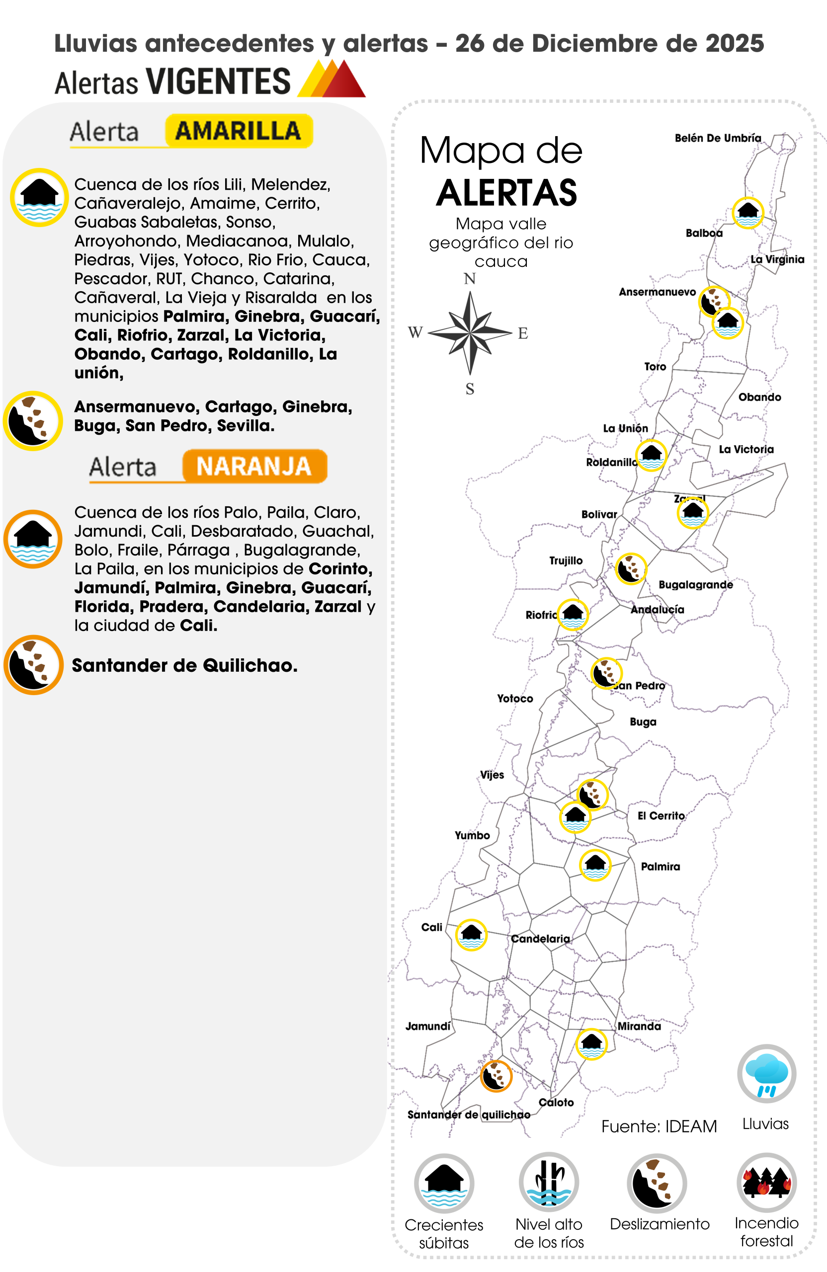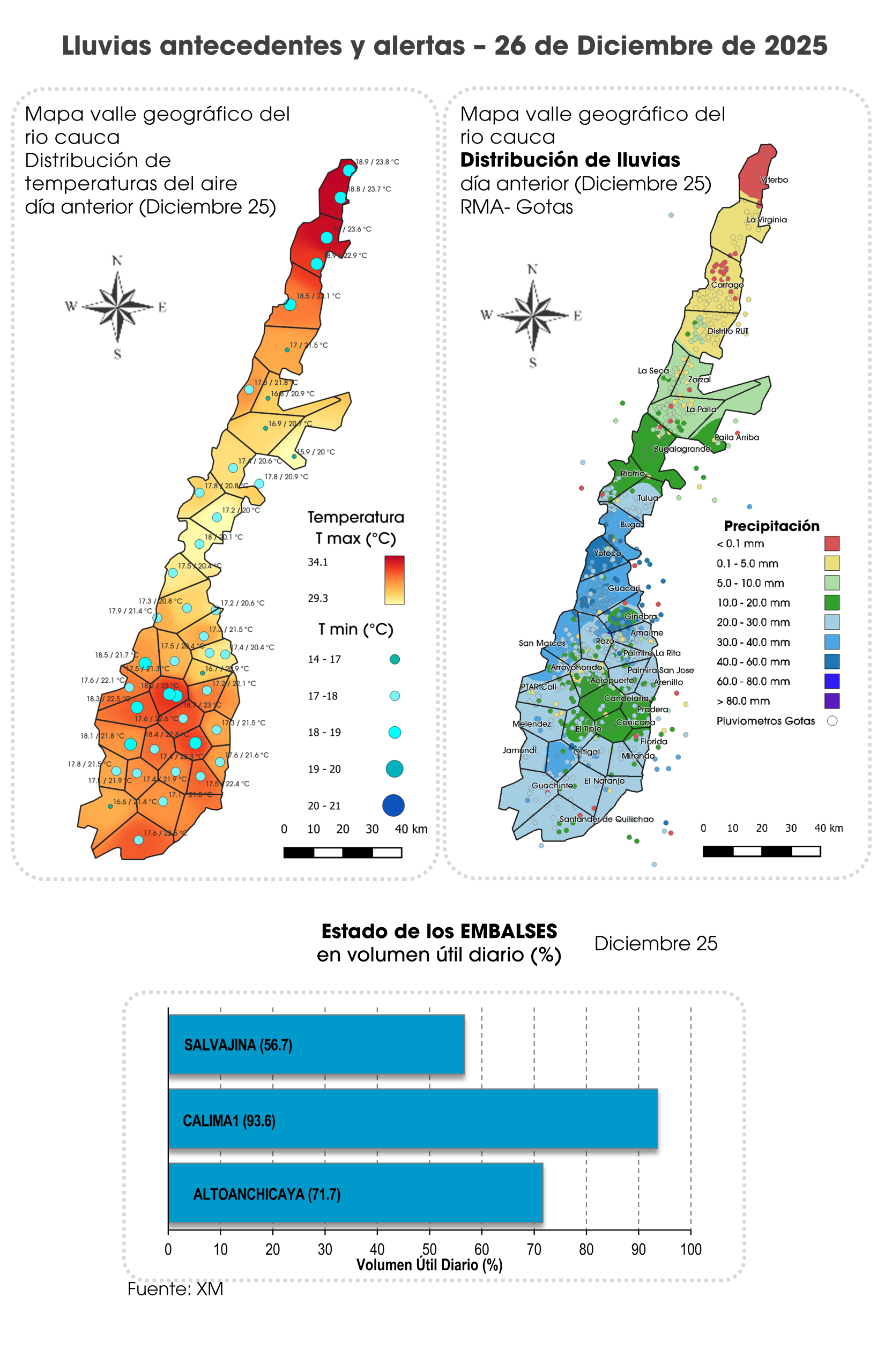 Durante la mañana se presentó cielo nublado con tiempo seco.   En la tarde se prevé cielo seminublado sin descartar lluvias ligeras hacia el piedemonte de Guachinte y de la cordillera central.  En la noche no se descartan lloviznas en Centro Sur Miranda y el valle del río Risaralda. //DICIEMBRE 27: Se espera cielo entre parcial a mayormente nublado en la jornada sin descartar lluvias ligeras hacia el oriente y sur del valle del río Cauca al caer la tarde y en horas de la noche. //DICIEMBRE 28: En la madrugada del 28 se prevén probables chubascos en Norte 2b, Centro Oriente, Centro Sur y Sur; lloviznas en las demás regiones.    Lluvias ligeras en el resto de la jornada en la región.