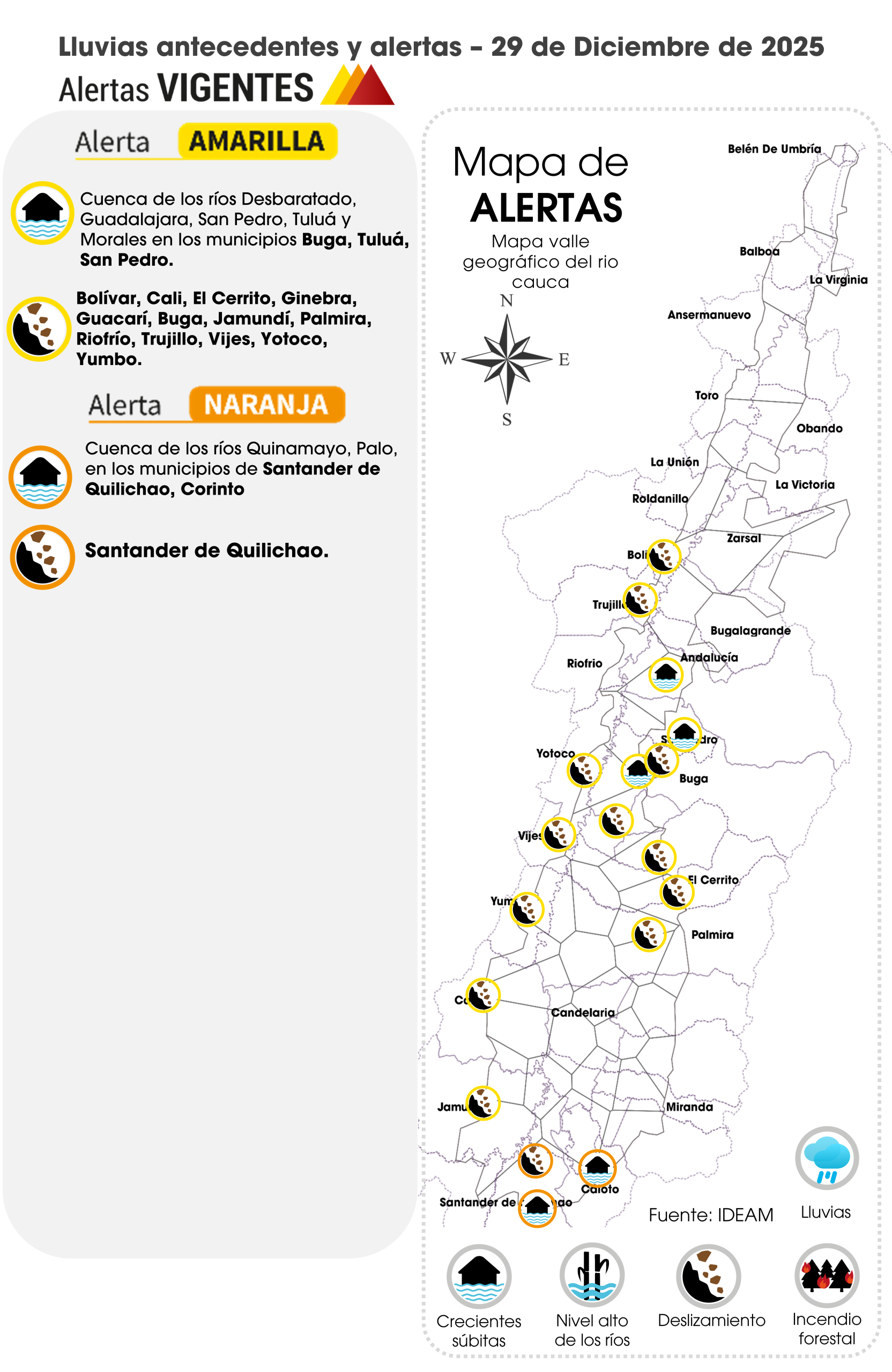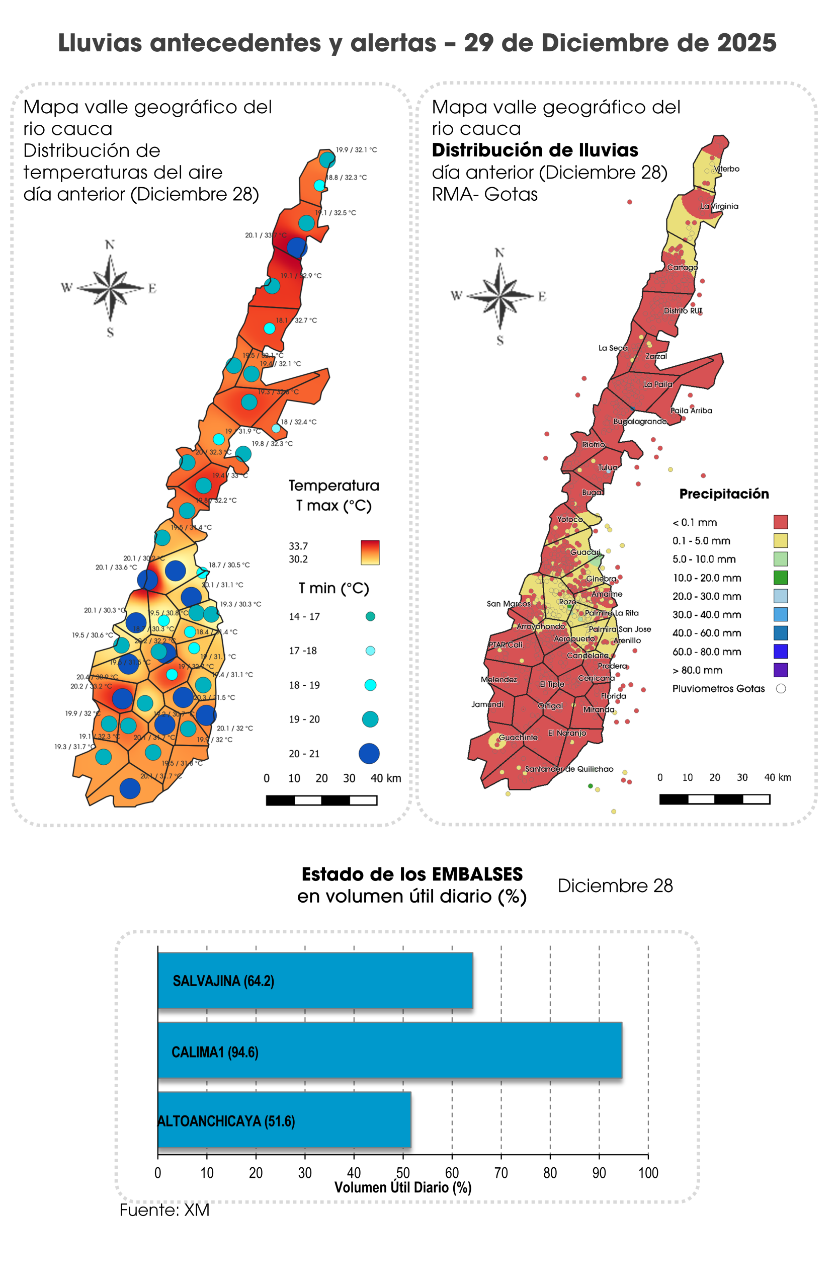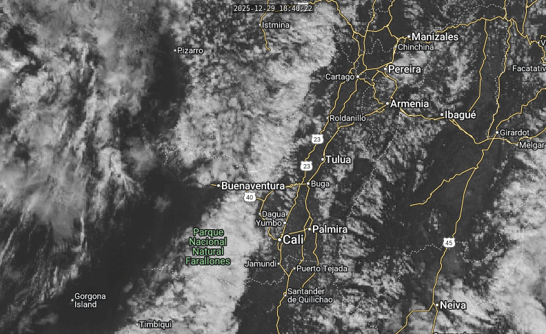 Gran parte del valle del río Cauca ha presentado cielo seminublado.  Se estima que continúen las condiciones de tiempo seco y seminublado en la tarde y en la noche a lo largo del valle del río Cauca. //DICIEMBRE 30:  Se estima que se presente tiempo seco en la mañana, en la tarde se prevé mayor nubosidad con probabilidad de lluvias ligeras y/o lloviznas en Centro Sur, Sur y Guahinte, así como en el sur de Centro Oriente.