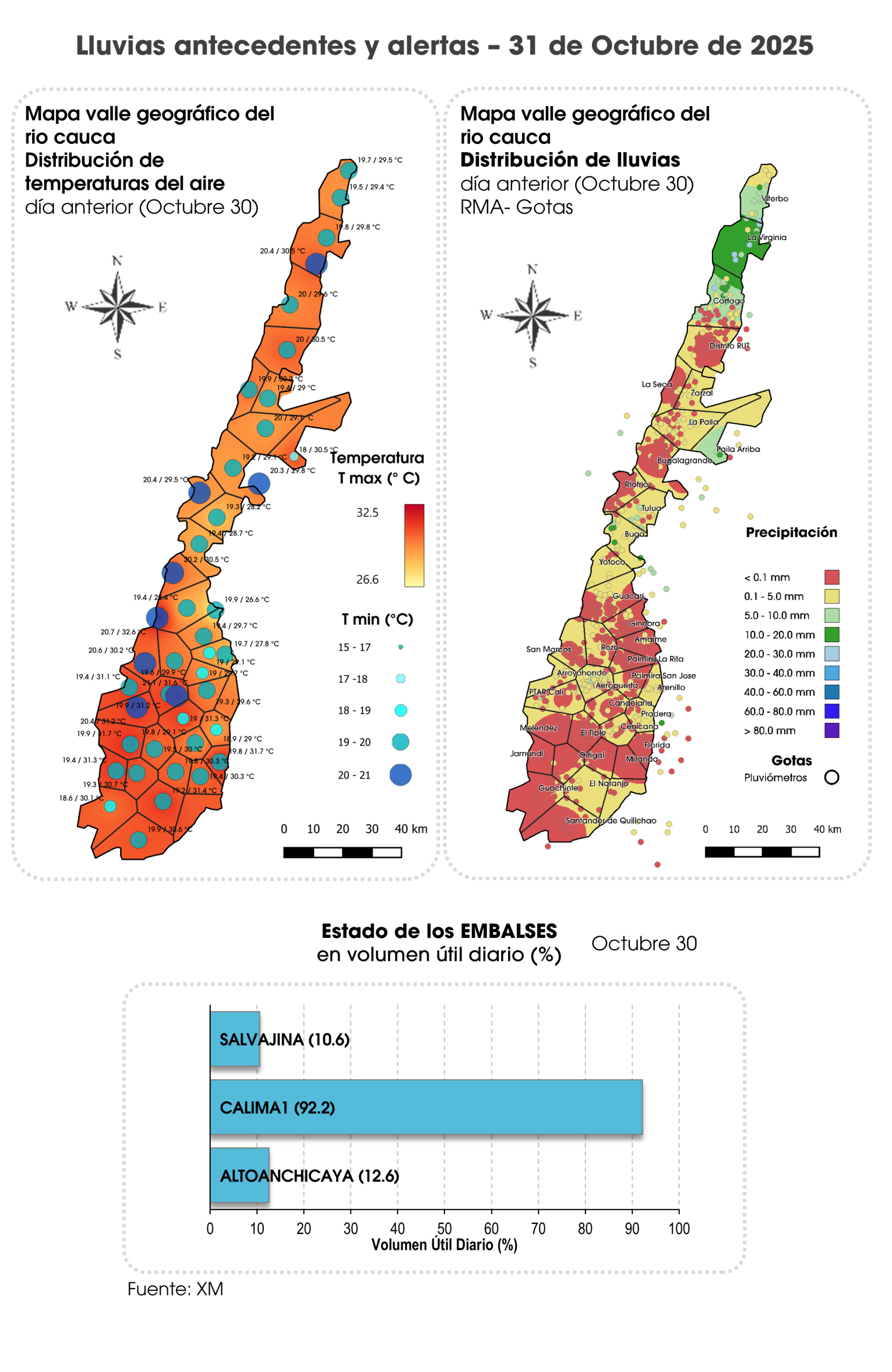 Noviembre 1: La jornada transcurrirá con cielo parcialmente nublado con probabilidad de ocurrencia de chubascos en Buga, Jamundí, Sur de Cali y zona Sur. En el valle del río Risaralda lluvias ligeras al caer la tarde e inicios de la noche.