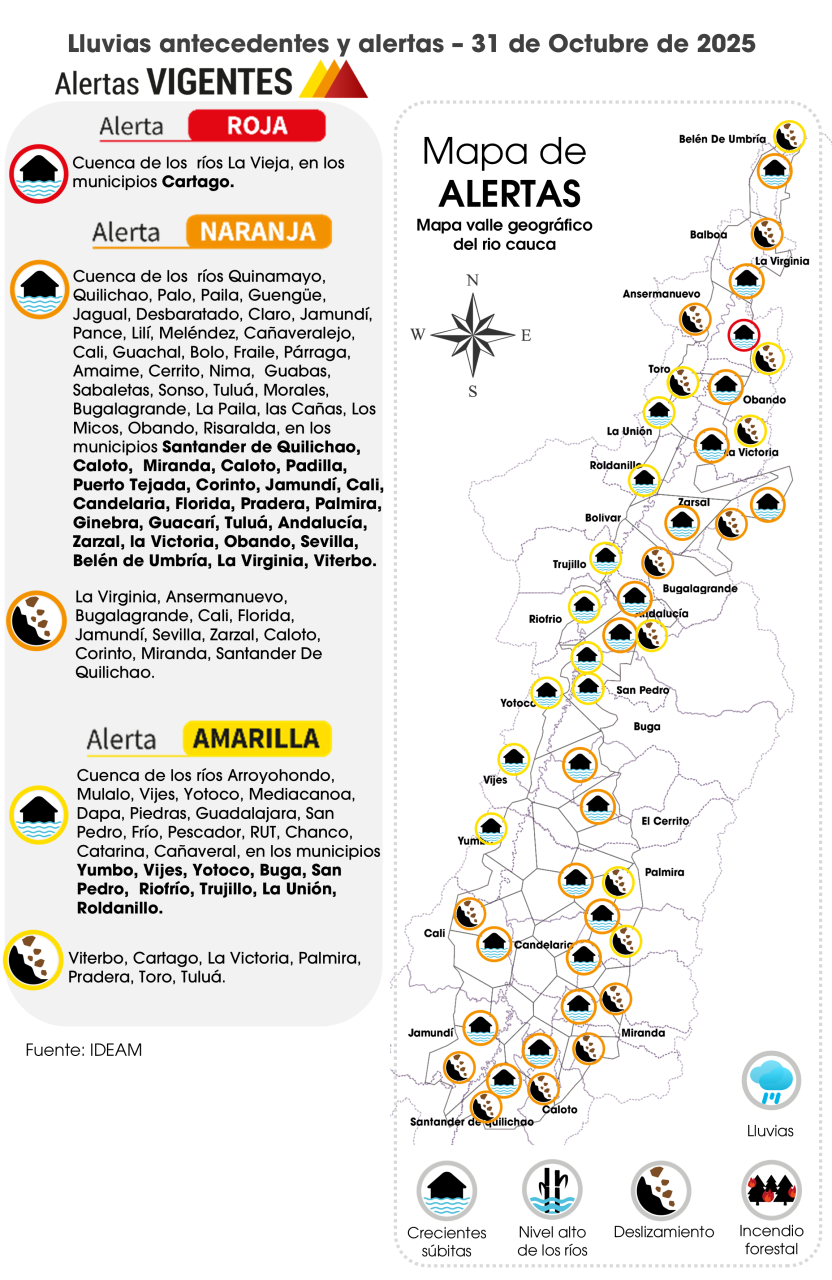 Noviembre 2: Luego de una mañana con tiempo seco se prevén en la tarde lluvias y/o chubascos en el valle del río Risaralda, Cartago, Norte 2b, Guachinte y Sur; lluvias ligeras en Note 2a y Centro Oriente.