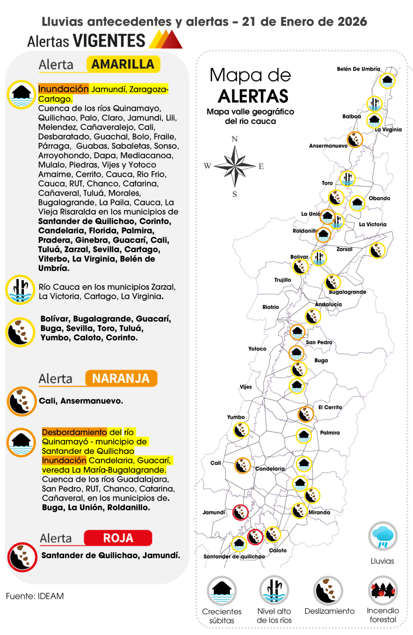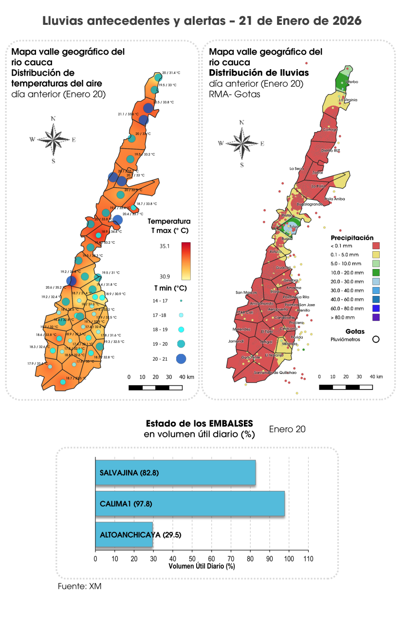 Durante la mañana prevaleció el tiempo seco con cielo parcialmente cubierto.   Se prevé que en la tarde el norte y parte del centro del VRC presente cielo seminublado sin descartar lloviznas hacia el flanco oriental sobre la cordillera central.  En la tarde y noche en las zonas de Centro Oriente, Centro Sur, Sur y sur de Guachinte se esperan intervalos de lluvias ligeras. En la madrugada no se descartan lloviznas en el norte del VRC. ENERO 22:  El inicio de la jornada tendrá cielo nublado y mayormente nublado sin descartar eventos de lloviznas y/o lluvias ligeras en el valle del río Risaralda, Centro Oriente, Centro Sur, Sur y Guachinte.  En horas de la tarde están previstas lluvias en el Norte 2a y 2b, Centro Oriente y centro Occidente; lluvias de menor intensidad en las demás zonas. En la noche disminución de las precipitaciones.