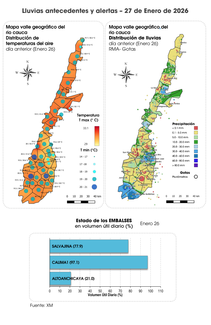 Durante la mañana se presentó cielo nublado en el centro y sur del VRC mientras que hacia el norte se registraron intervalos de sol. Para la tarde de hoy se estima incremento de nubosidad favoreciendo chubascos y lluvias inclusive con actividad eléctrica en las zonas Norte 2b, Centro Oriente, Centro Occidente, Sur, Centro Sur y Guachinte. Al iniciar la noche se estiman lluvias moderadas en Norte 2b, entre Centro Occidente y Centro Oriente y en Guachinte y occidente de Centro Sur.