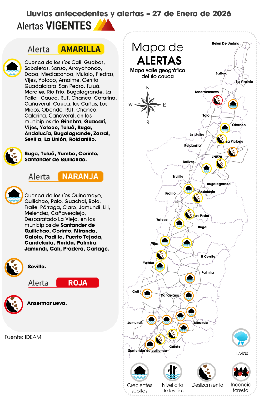 ENERO 28: Las lluvias son estimadas en la jornada de la tarde en el oriente de Norte 2a y 2b, Centro Oriente, Guachinte y occidente de Centro Sur;lluvias ligeras dispersas en las demás zonas. En la noche lluvias en Guachinte, Centro Sur, Norte 2b y en el valle del río Risaralda.