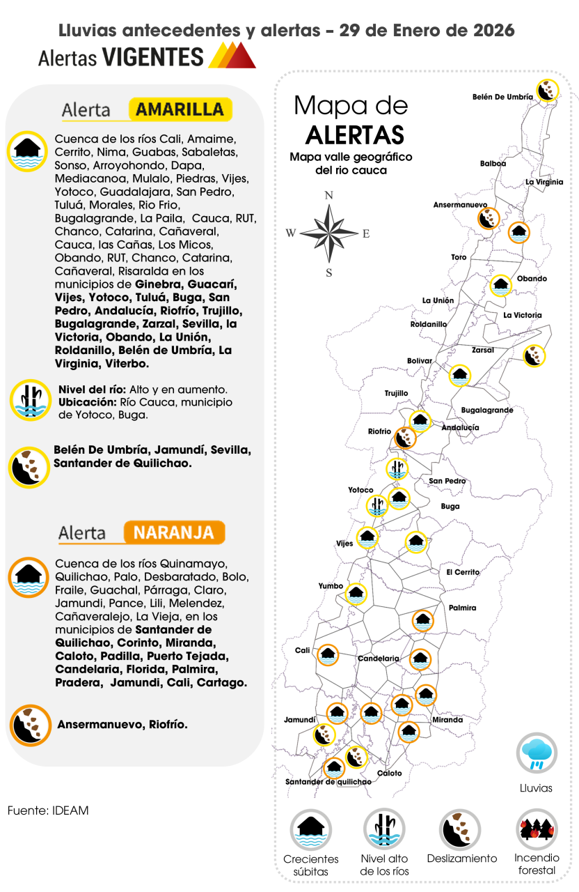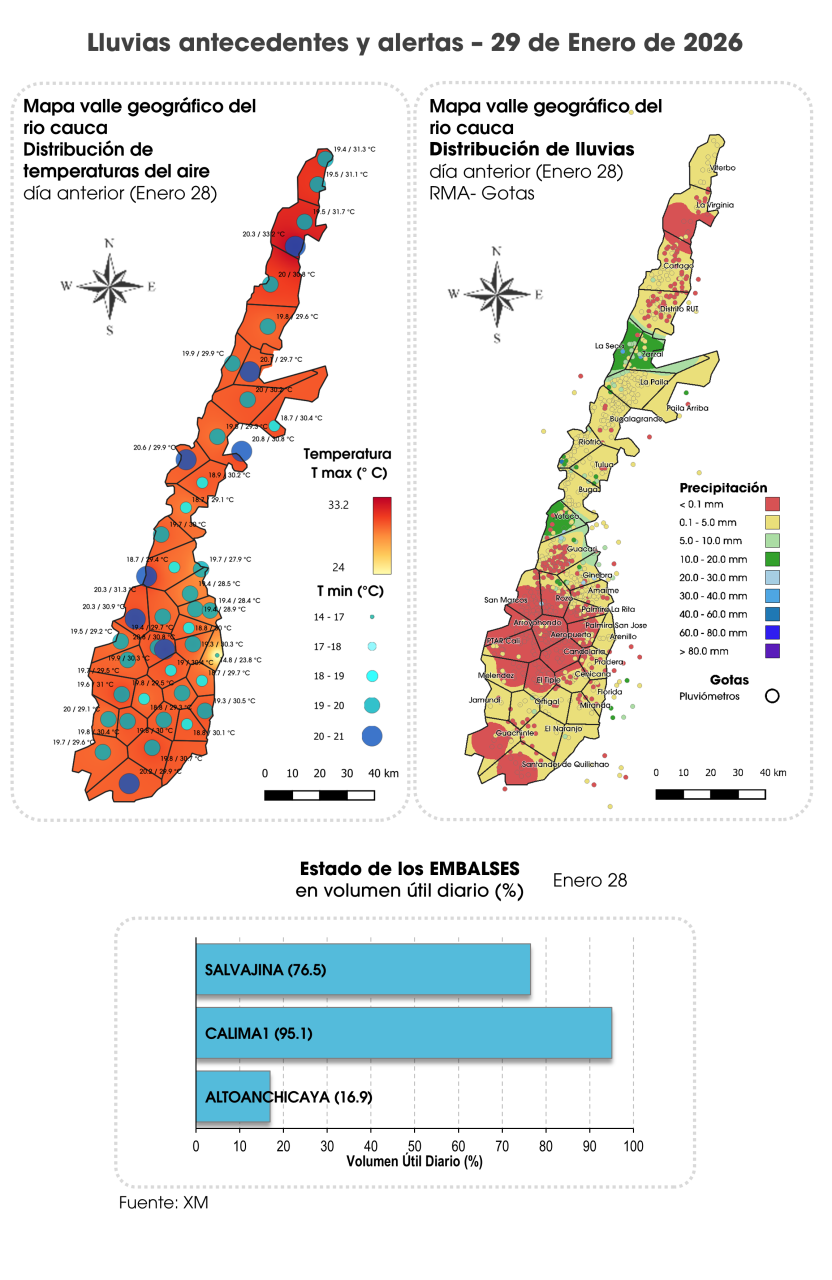 Muy temprano se presentó cielo despejado y a mitad de mañana ingreso nubosidad desde el suroriente y del occidente favoreciendo lluvias aisladas al cerrar la mañana en el sur del VRC. El pronóstico indica intervalos de lluvias ligeras en Guachinte, Centro Sur y Sur; no se descartan lloviznas en Centro Oriente y Norte 2b. En la noche son estimadas lluvias en Norte 2b, piedemonte de Centro Oriente, Centro Sur y Sur.