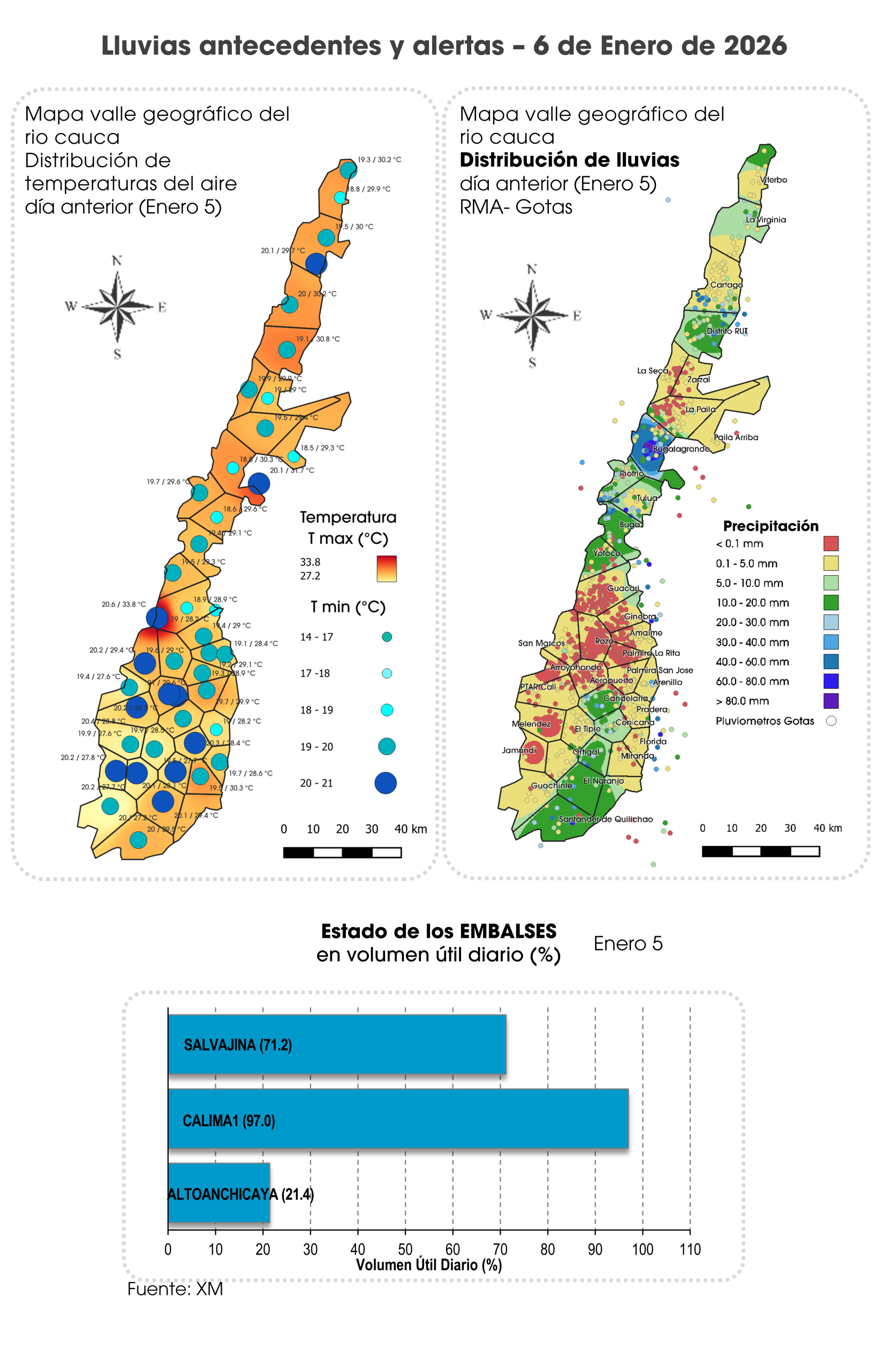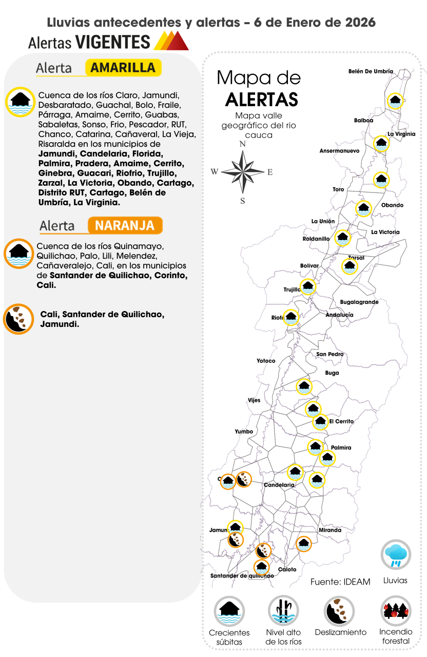 ENERO 7: Se espera una jornada con nubosidad variables, con probables lluvias ligeras en horas de la tarde en las zonas Norte 2b, Centro Oriente y Guachinte; lloviznas esporádicas en las demás zonas. En la noche lluvias moderadas en Norte 2b, Guachinte Centro Sur y Sur.