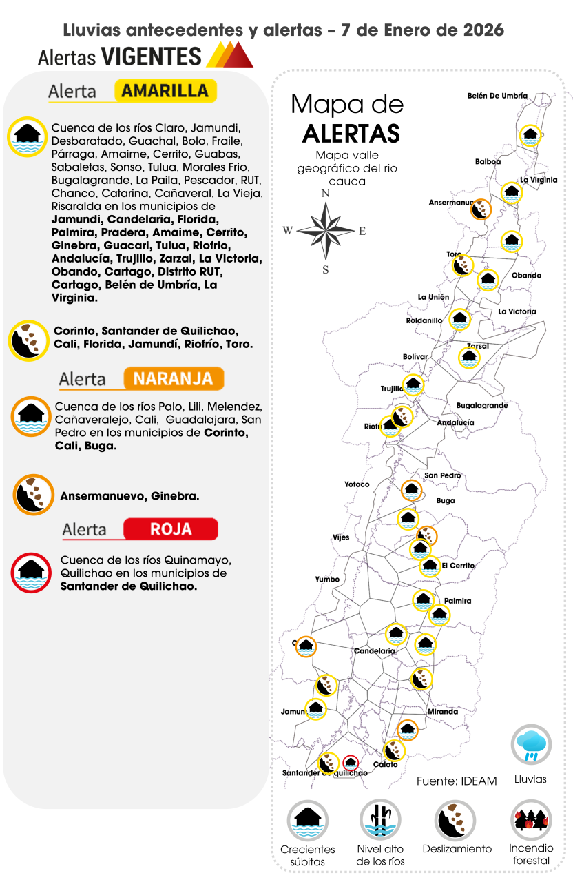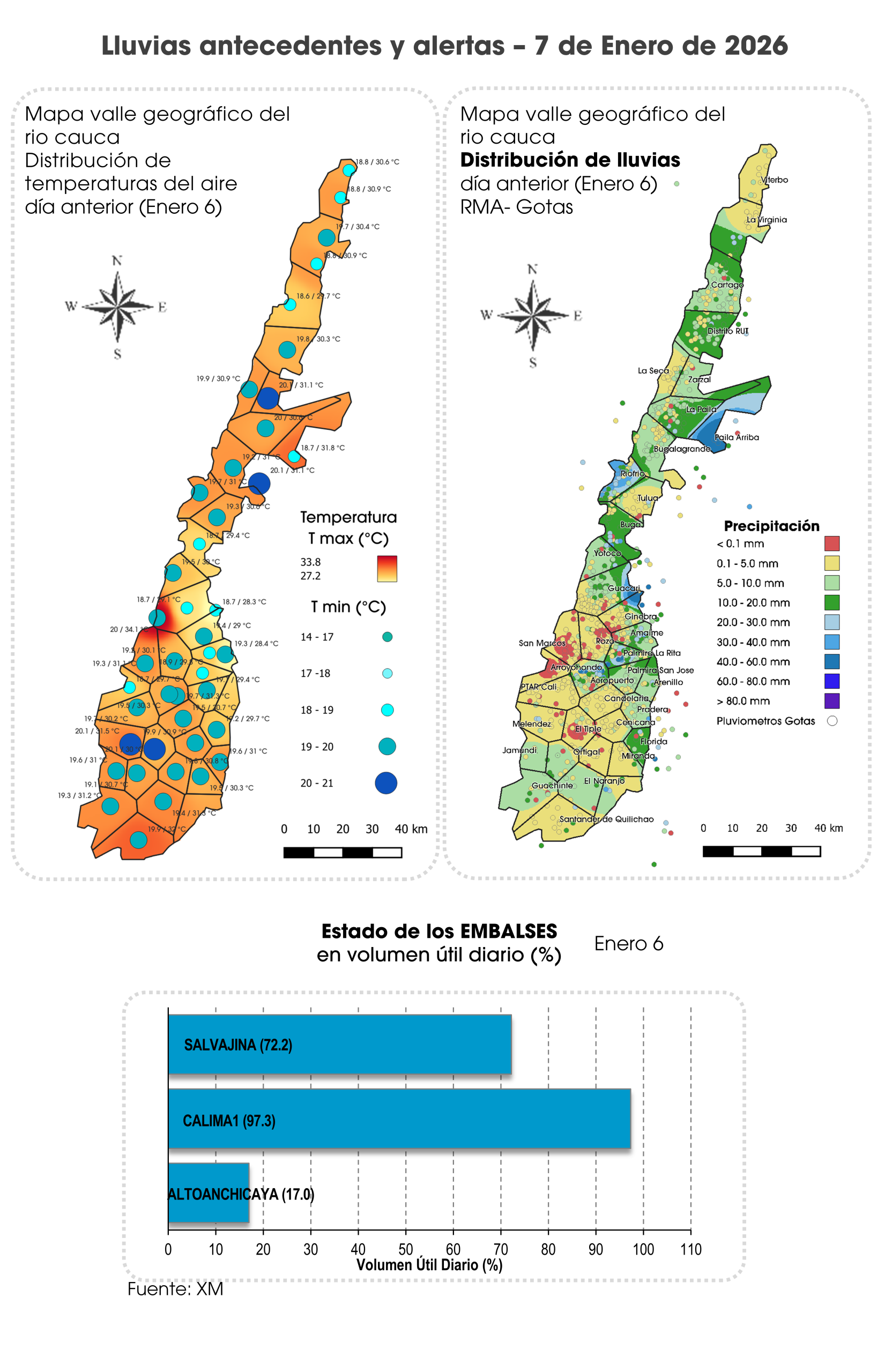 ENERO 8: Iniciando la jornada no se descartan lloviznas en el extremo sur del VRC; en la tarde se advierten chubascos en Norte 2b, Guachinte, Sur y piedemonte de la cordillera Central; lluvias de menor intensidad en Norte 2a y el valle del río Risaralda.