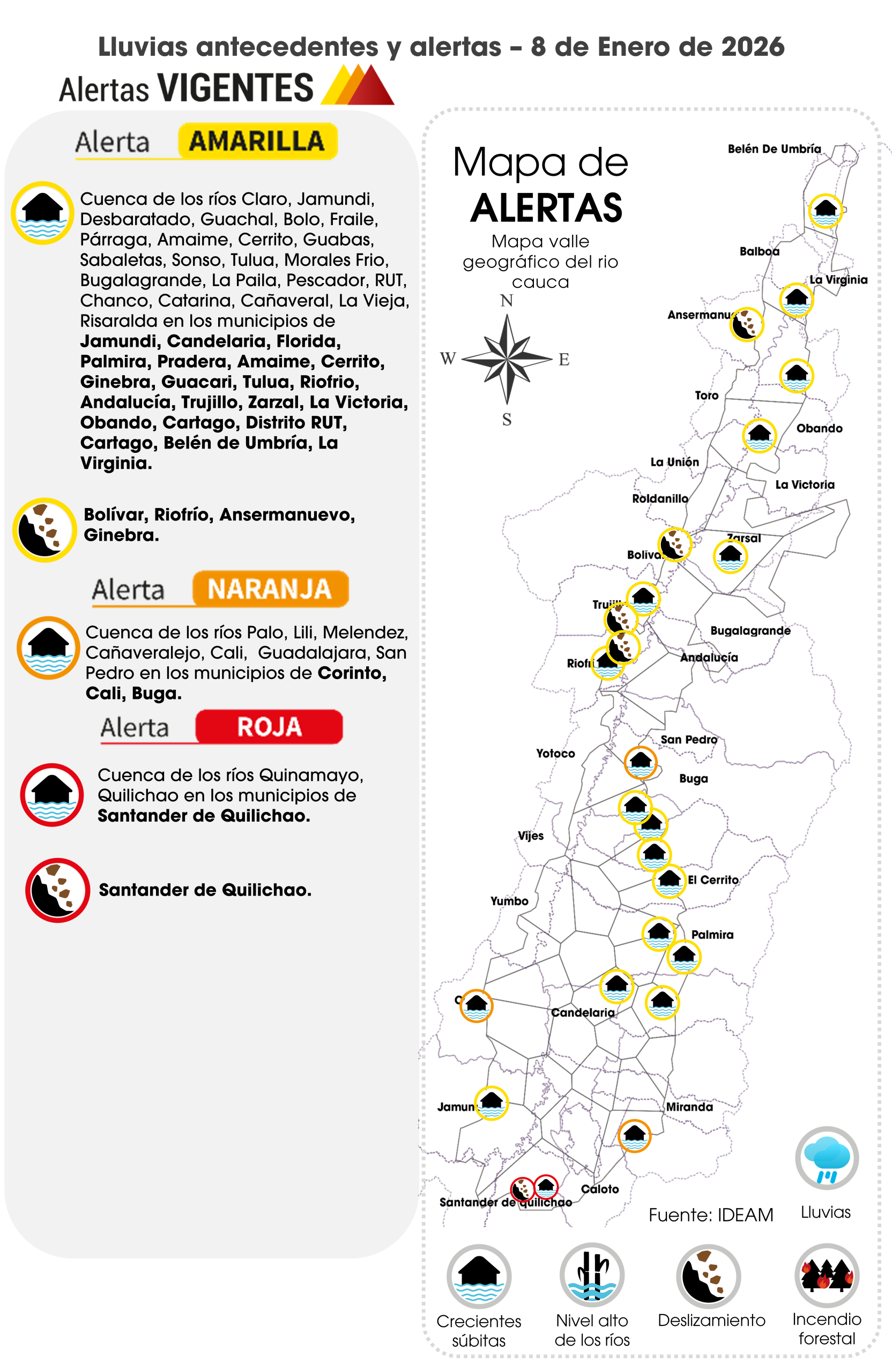 ENERO 9: Las precipitaciones pueden ocurrir en la tarde en el centro y el oriente en las zonas Norte 2b, Centro Oriente, Centro Sur, Sur y Guachinte; lluvias ligeras y lloviznas en las demás zonas.