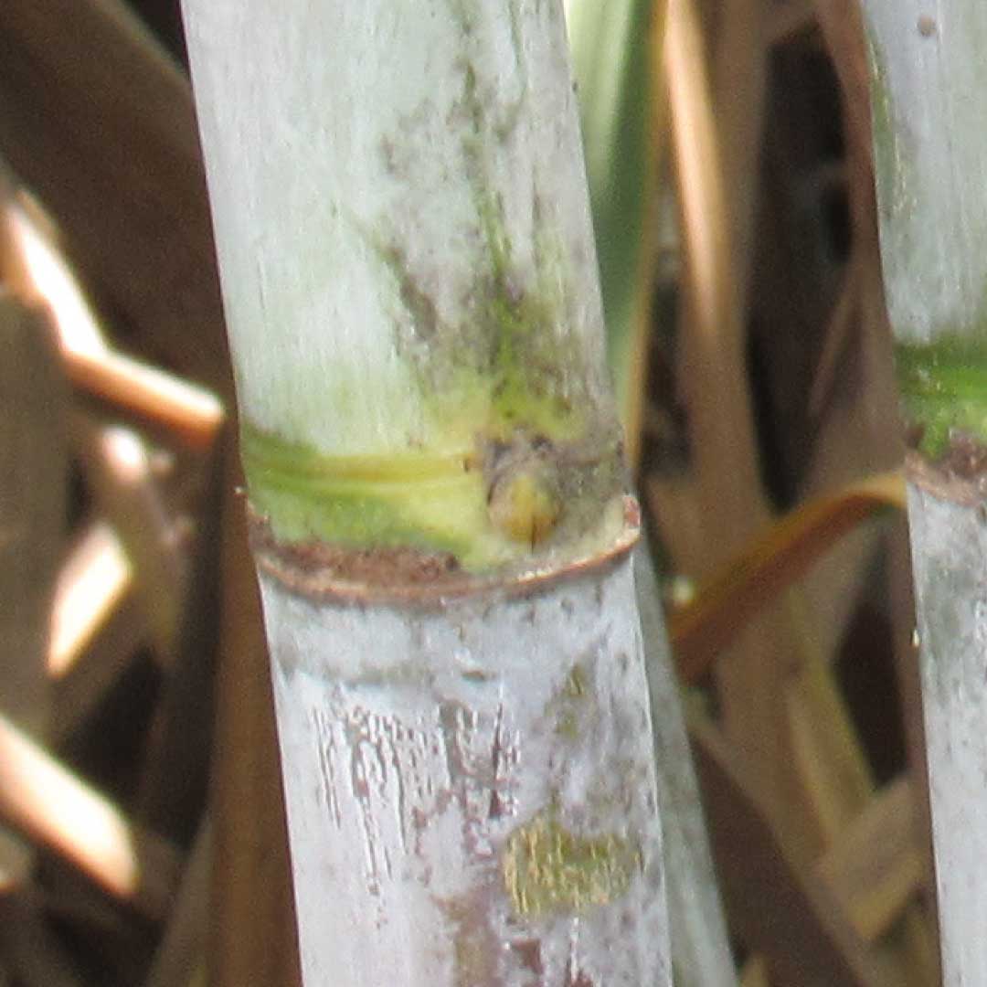 Altura entre 267 cm – 392 cm, erecto, con disposición de los entrenudos en zig-zag suave. Entrenudo: cilíndrico con diámetro de 35 mm – 43 mm. De color verde amarillento cuando no está expuesto al sol, y amarillo verdoso cuando lo está. Tiene mucha cera y no tiene canal de yema. Tiene poca cera y el canal de yema es ausente. Nudo: tiene anillo de crecimiento de 3.3 mm. de ancho. Yema: obovada, siempre sobre pasa el anillo de crecimiento.