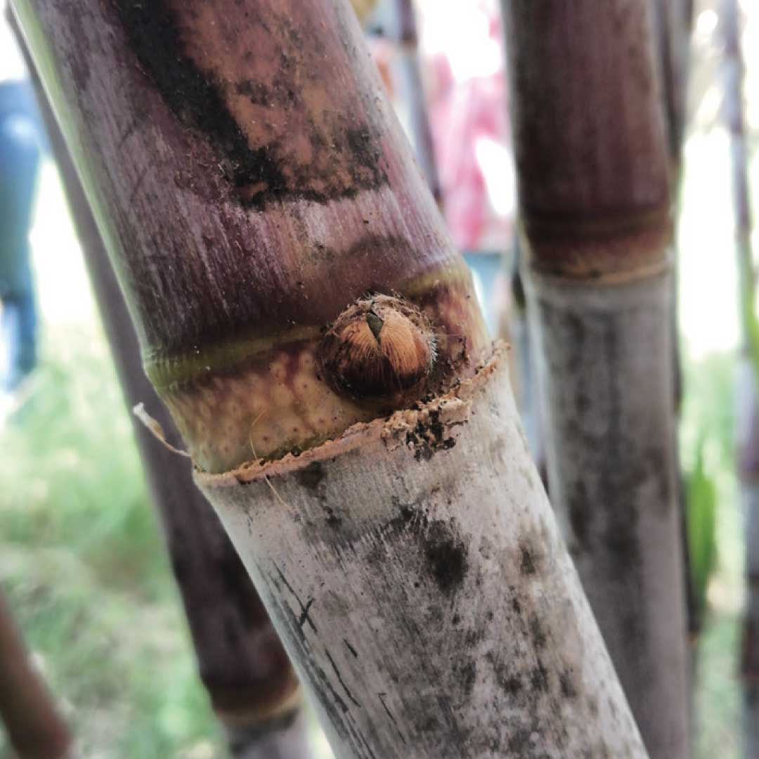 Altura entre 200 cm – 300 cm, erecto, con disposición de los entrenudos en zig-zag suave. Entrenudo: cilíndrico con longitud de 150 mm y diámetro de 24.4 mm – 28.9 mm. De color morado amarillo cuando no está expuesto al sol y morado rojo cuando lo está. Tiene mucha cera y el canal de yema es ausente. Nudo: tiene anillo de crecimiento con prominencia media. Yema: pentagonal y en relación con el anillo de crecimiento no lo sobrepasa.